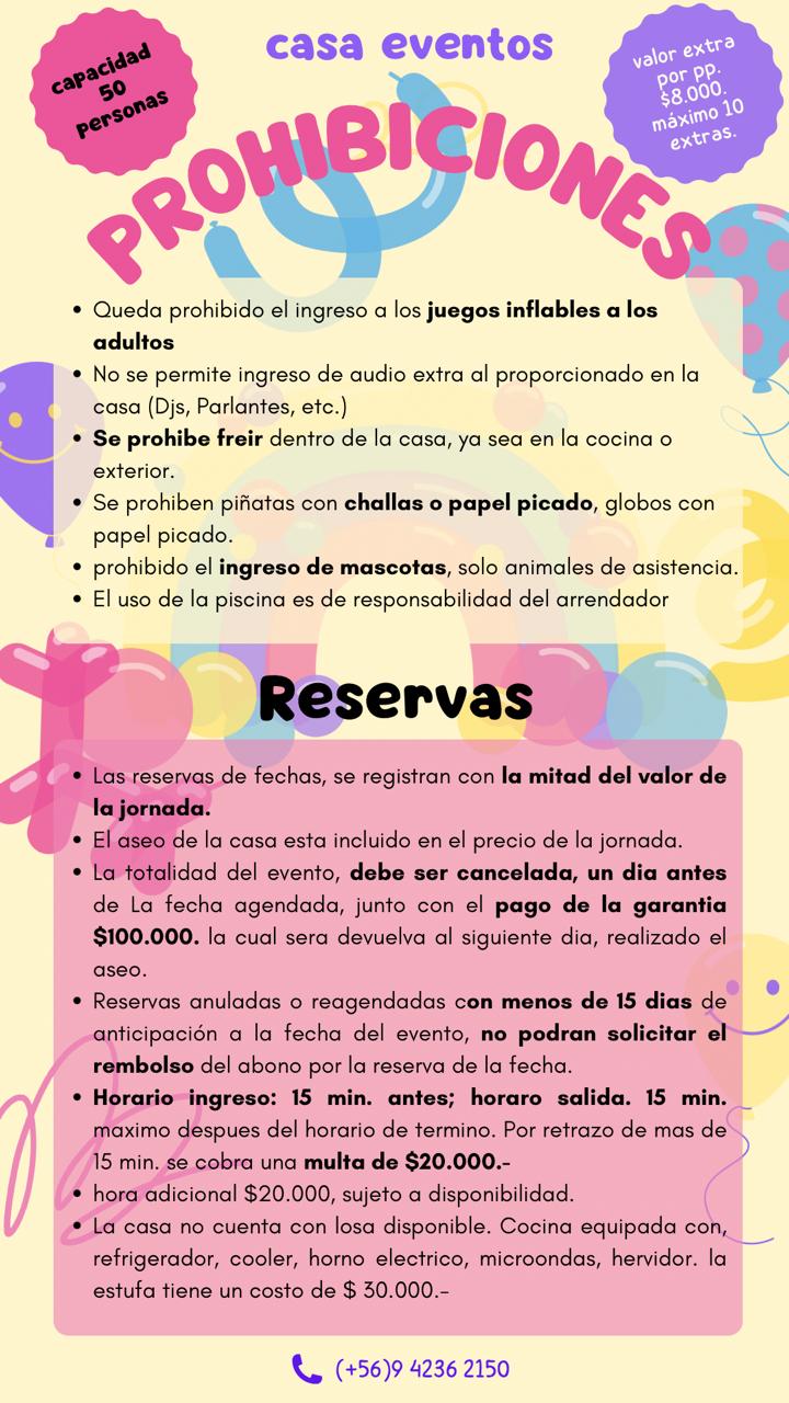 Se aplica un recargo de $30.000 en las reservas realizadas entre los meses de noviembre y marzo. Durante este período, la piscina estará disponible de manera templada.